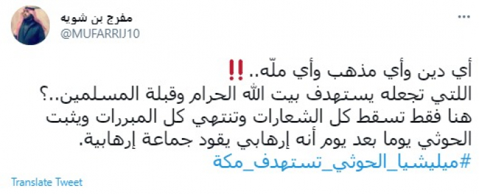 وقال في تغريدة عبر "تويتر" رصدها "المشهد العربي": "أي دين وأي مذهب وأي ملّه.. اللتي تجعله يستهدف بيت الله الحرام وقبلة المسلمين..؟".
