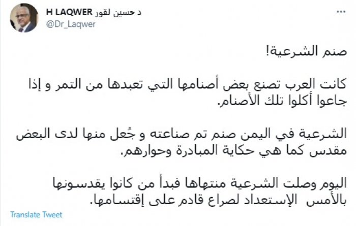 وقال في تغريدة عبر "تويتر" رصدها "المشهد العربي": "صنم الشرعية.. كانت العرب تصنع بعض أصنامها التي تعبدها من التمر وإذا جاعوا أكلوا تلك الأصنام".