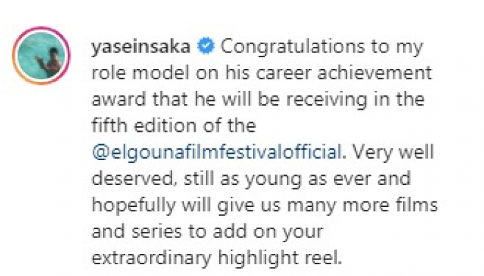 ونشر "ياسين" صورة بالأبيض والأسود تجمعه بوالده، وعلق :"مبروك لمثلي الأعلى على جائزة الإنجاز الإبداعي التي سيحصل عليها في الدورة الخامسة لمهرجان الجونة السينمائي".