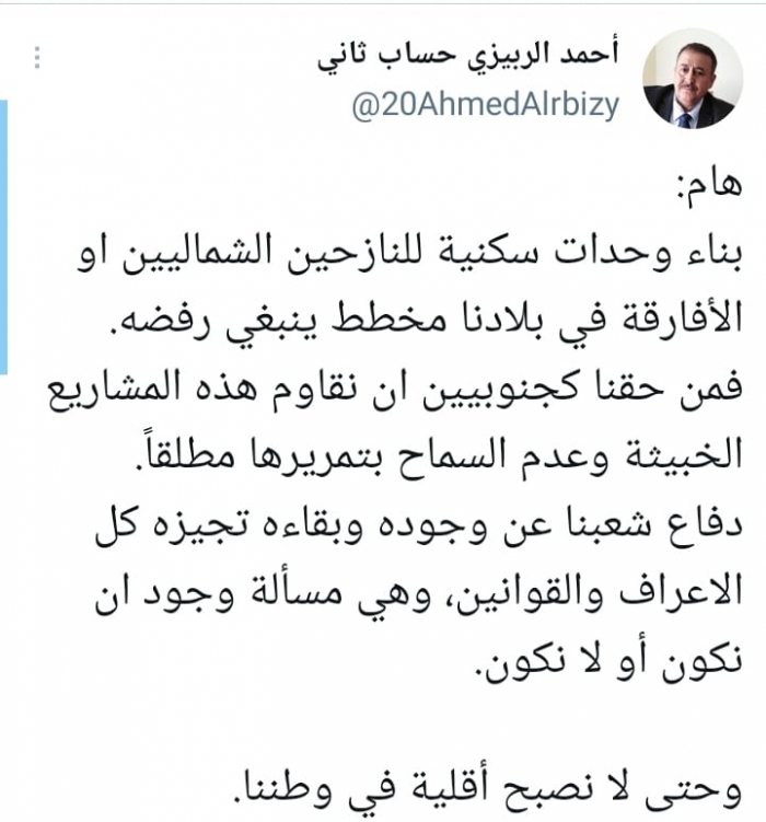 وأشار في تغريدة على حسابه بموقع التدوين المصغر تويتر، اليوم إلى أنه: "هام: بناء وحدات سكنية للنازحين الشماليين أو الأفارقة في بلادنا مخطط ينبغي رفضه".