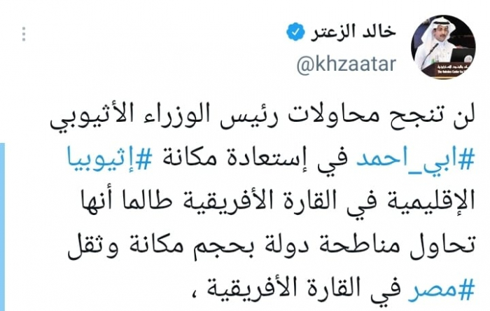 وشدد في تغريدة على حسابه بموقع التدوين المصغر تويتر، اليوم على أنه: "لن تنجح محاولات رئيس الوزراء الإثيوبي أبي أحمد في استعادة مكانة إثيوبيا الإقليمية في القارة الأفريقية طالما أنها تحاول مناطحة دولة بحجم مكانة وثقل مصر في القارة الأفريقية".