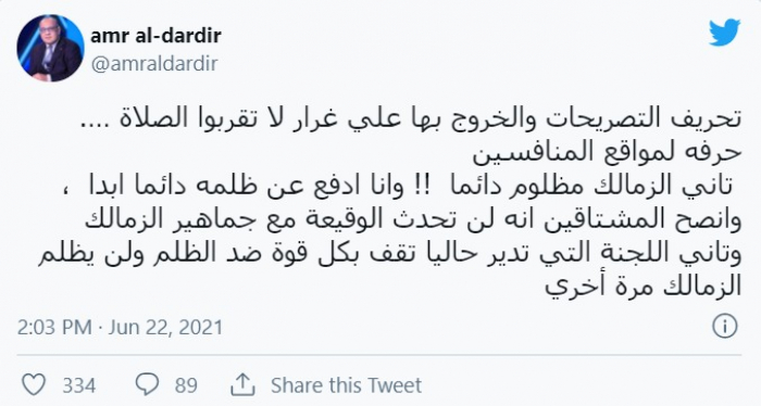 ورد الدرديري على هذا الأمر عبر حسابه على تويتر قائلاً:"تحريف التصريحات والخروج بها علي غرار لا تقربوا الصلاة.. حرفه لمواقع المنافسين".