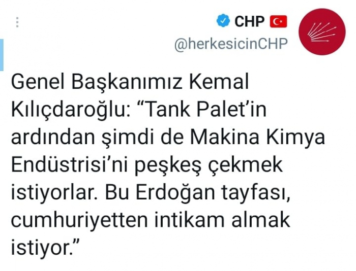 ونقل الحساب الرسمي للحزب على موقع التدوين المصغر تويتر، تصريحات لأوغلو جاء فيها: "يريدون الآن بيع صناعة الآلات الكيماوية"، مضيفا أن: "طاقم أردوغان يريد الانتقام من الجمهورية ".