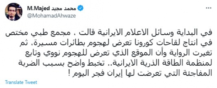 وكتب في تغريدة عبر "تويتر" رصدها "المشهد العربي": "في البداية وسائل الإعلام الإيرانية قالت ، مجمع طبي مختص في إنتاج لقاحات كورونا تعرض لهجوم بطائرات مسيرة، ثم تغيرت الرواية وأن الموقع الذي تعرض للهجوم نووي وتابع لمنظمة الطاقة الذرية الإيرانية".