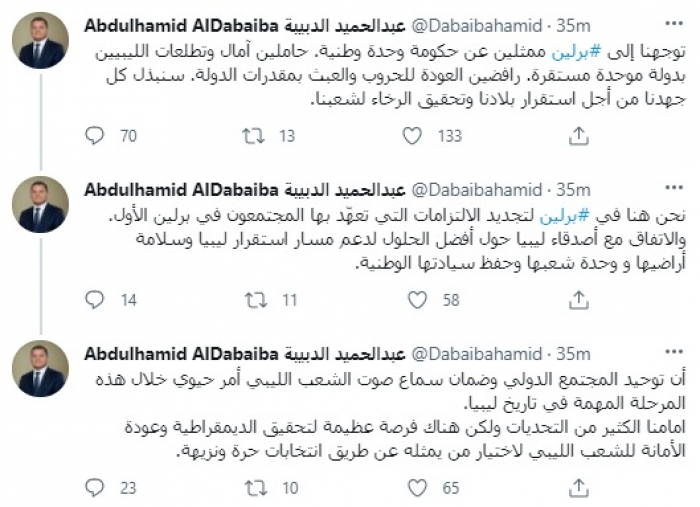 وقال في سلسلة تغريدات عبر "تويتر" رصدها "المشهد العربي": "توجهنا إلى برلين ممثلين عن حكومة وحدة وطنية. حاملين آمال وتطلعات الليبيين بدولة موحدة مستقرة. رافضين العودة للحروب والعبث بمقدرات الدولة. سنبذل كل جهدنا من أجل استقرار بلادنا وتحقيق الرخاء لشعبنا".