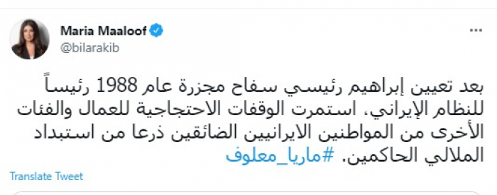 وكتبت في تغريدة عبر "تويتر" رصدها "المشهد العربي": "بعد تعيين إبراهيم رئيسي سفاح مجزرة عام 1988 رئيساً للنظام الإيراني، استمرت الوقفات الاحتجاجية للعمال والفئات الأخرى من المواطنين الايرانيين الضائقين ذرعا من استبداد الملالي الحاكمين".