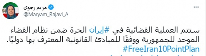 وقالت في تغريدة عبر "تويتر" رصدها "المشهد العربي": "ستتم العملية القضائية في إيران الحرة ضمن نظام القضاء الموحد للجمهورية ووفقًا للمبادئ القانونية المعترف بها دوليًا".