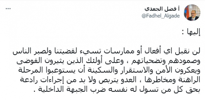 رفض فضل الجعدي، عضو هيئة رئاسة المجلس الانتقالي الجنوبي، أي محاولات للمساس بقضية الجنوب وتضحيات الشعب، بتعكير الأمن والاستقرار، مطالبًا الجميع باستيعاب مقتضيات المرحلة.