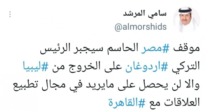 وقال في تغريدة على حسابه بموقع التدوين المصغر تويتر، اليوم إنه: "موقف مصر الحاسم سيجبر الرئيس التركي أردوغان على الخروج من ليبيا وإلا لن يحصل على ما يريد في مجال تطبيع العلاقات مع القاهرة".