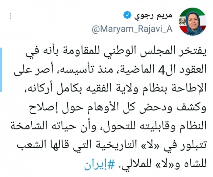 وأوضحت في تغريدة على حسابها بموقع التدوين المصغر تويتر، اليوم أنه: "يفتخر المجلس الوطني للمقاومة بأنه في العقود الـ 4 الماضية، منذ تأسيسه، أصر على الإطاحة بنظام ولاية الفقيه بكامل أركانه".