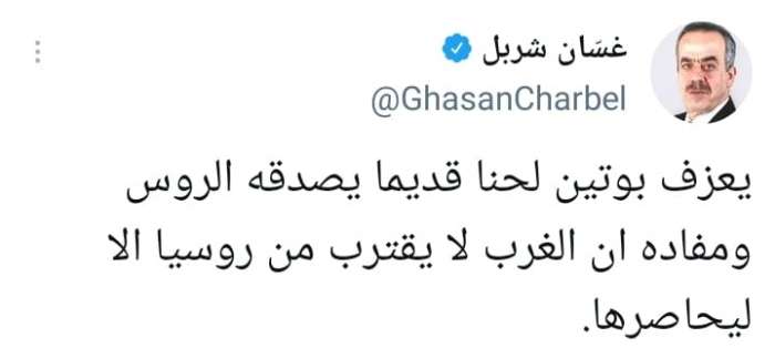 وشدد في تغريدة على حسابه بموقع التدوين المصغر تويتر، اليوم على أنه: "يعزف بوتين لحنا قديما يصدقه الروس ومفاده أن الغرب لا يقترب من روسيا إلا ليحاصرها".