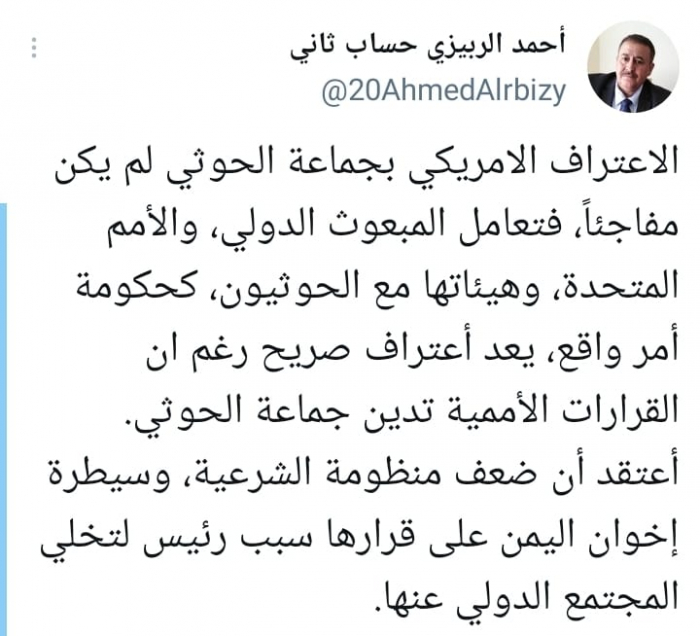 وأشار في تغريدة على حسابه بموقع التدوين المصغر تويتر، اليوم إلى أن: "الاعتراف الأمريكي بجماعة الحوثي لم يكن مفاجئًا".
