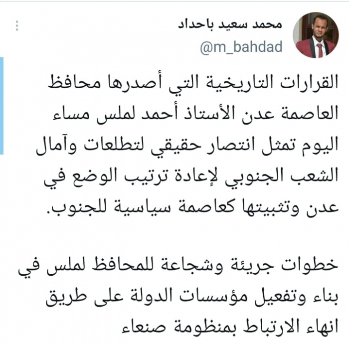 وشدد في تغريدة على حسابه بموقع التدوين المصغر تويتر، اليوم على أن: "القرارات التاريخية التي أصدرها محافظ العاصمة عدن الأستاذ أحمد لملس مساء اليوم تمثل انتصار حقيقي لتطلعات وآمال الشعب الجنوبي".
