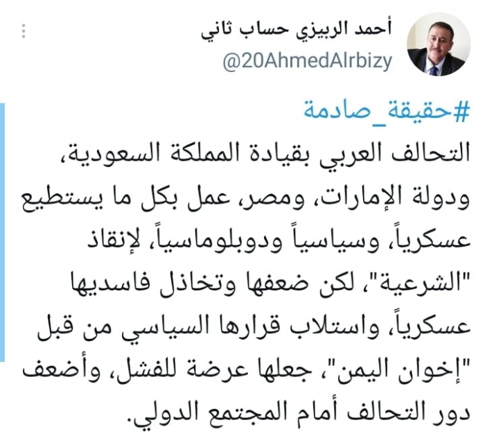 وشدد على أن: "ضعفها وتخاذل فاسديها عسكرياً، واستلاب قرارها السياسي من قبل "إخوان اليمن"، جعلها عرضة للفشل، وأضعف دور التحالف أمام المجتمع الدولي".