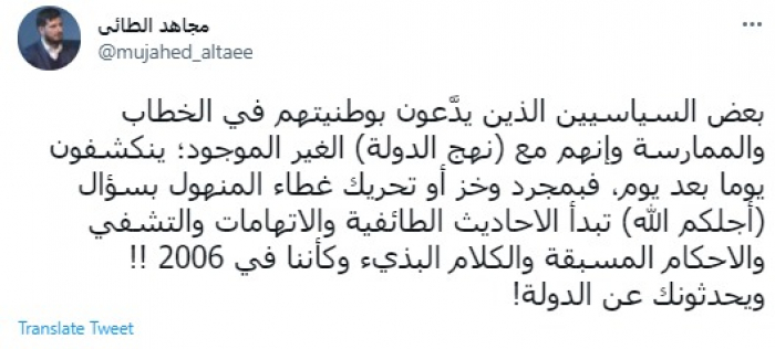 وأضاف: "فبمجرد وخز أو تحريك غطاء المنهول بسؤال (أجلكم الله) تبدأ الأحاديث الطائفية والاتهامات والتشفي والأحكام المسبقة والكلام البذيء وكأننا في 2006 !! ويحدثونك عن الدولة".