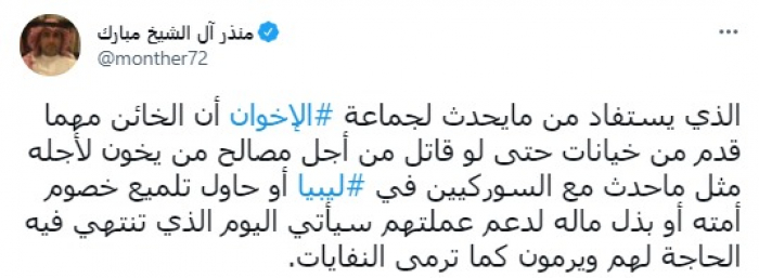 وقال في تغريدة عبر "تويتر" رصدها "المشهد العربي": "الذي يستفاد من مايحدث لجماعة الإخوان أن الخائن مهما قدم من خيانات حتى لو قاتل من أجل مصالح من يخون لأجله مثل ما حدث مع السوركيين في ليبيا أو حاول تلميع خصوم أمته أو بذل ما له لدعم عملتهم".