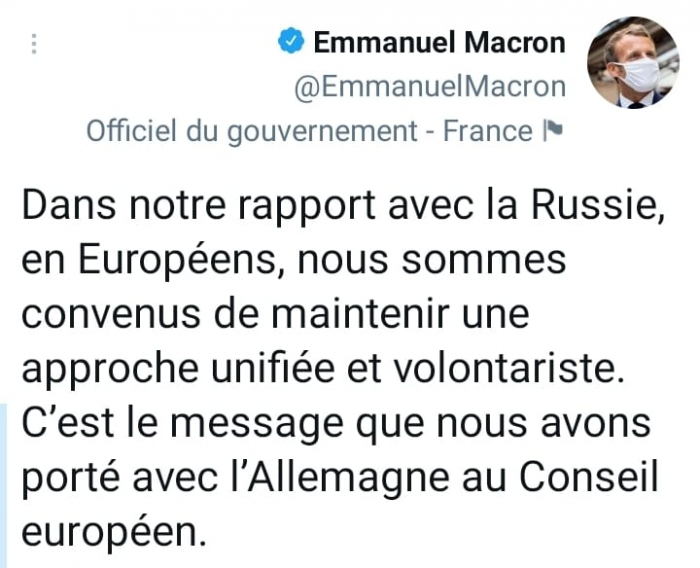 وقال في تغريدة على حسابه بموقع التدوين المصغر تويتر، اليوم إن: "في علاقتنا مع روسيا، كأوروبيين، اتفقنا على الحفاظ على نهج موحد واستباقي".