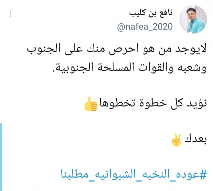 وقال في تغريدة على حسابه بموقع التدوين المصغر تويتر، اليوم الجمعة، موجها حديثه إلى الرئيس الزُبيدي إنه: "لا يوجد من هو أحرص منك على الجنوب وشعبه والقوات المسلحة الجنوبية، نؤيد كل خطوة تخطوها، بعدك"، مختتما بهاشتاج: "عودة النخبة الشبوانية مطلبنا".