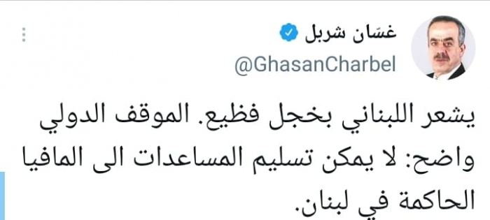 وقال في تغريدة على حسابه بموقع التدوين المصغر تويتر، اليوم إنه: "يشعر اللبناني بخجل فظيع، الموقف الدولي واضح: لا يمكن تسليم المساعدات إلى المافيا الحاكمة في لبنان".