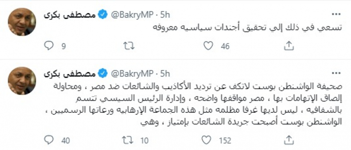 وقال في تغريدة عبر "تويتر" رصدها "المشهد العربي": "صحيفة الواشنطن بوست لا تكف عن ترديد الأكاذيب والشائعات ضد مصر، ومحاولة إلصاق الاتهامات بها".