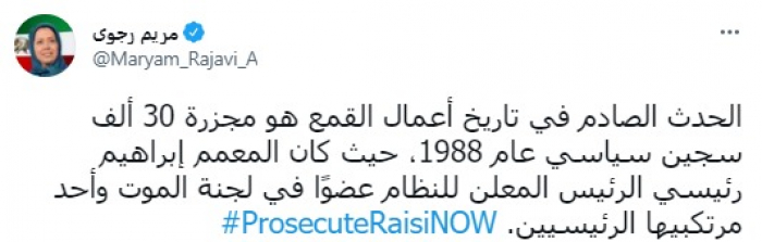 وكتبت في تغريدة عبر "تويتر" رصدها "المشهد العربي": "الحدث الصادم في تاريخ أعمال القمع هو مجزرة 30 ألف سجين سياسي عام 1988، حيث كان المعمم إبراهيم رئيسي الرئيس المعلن للنظام عضوًا في لجنة الموت وأحد مرتكبيها الرئيسيين".