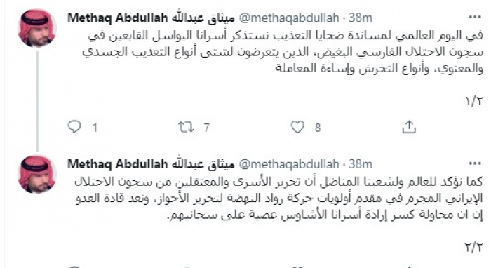وقال في تغريدات عبر "تويتر" رصدها "المشهد العربي، اليوم ": "في اليوم العالمي لمساندة ضحايا التعذيب نستذكر أسرانا البواسل القابعين في سجون الاحتلال الفارسي البغيض، الذين يتعرضون لشتى أنواع التعذيب الجسدي والمعنوي، وأنواع التحرش وإساءة المعاملة".