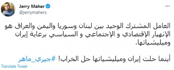 اتهم الكاتب الصحفي اللبناني جيري ماهر، اليوم السبت، إيران ومليشياتها بالتسبب في انهيار لبنان وسوريا واليمن والعراق.