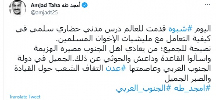 وقال في تغريدة عبر "تويتر" رصدها "المشهد العربي": "اليوم شبوة قدمت للعالم درس مدني حضاري سلمي في كيفية التعامل مع مليشيات الإخوان المسلمين".