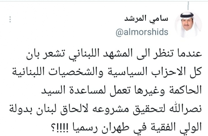 وقال في تغريدة على حسابه بموقع التدوين المصغر تويتر، اليوم إنه: "عندما تنظر إلى المشهد اللبناني تشعر بأن كل الأحزاب السياسية والشخصيات اللبنانية الحاكمة وغيرها تعمل لمساعدة السيد نصرالله لتحقيق مشروعه لإلحاق لبنان بدولة الولي الفقية في طهران رسميا".