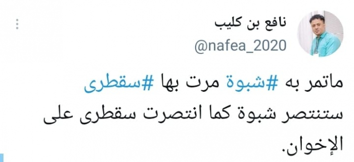 وقال في تغريدة على حسابه بموقع التدوين المصغر تويتر، اليوم إن: "ما تمر به شبوة مرت به سقطرى"، مضيفا أنه: "ستنتصر شبوة كما انتصرت سقطرى على الإخوان".