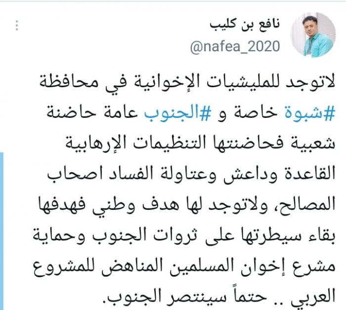 وأوضح في تغريدة على حسابه بموقع التدوين المصغر تويتر، اليوم أنه: "لا توجد للمليشيات الإخوانية في محافظة شبوة خاصة والجنوب عامة حاضنة شعبية".