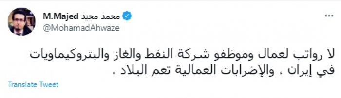 وكتب في تغريدة عبر "تويتر" رصدها "المشهد العربي": "لا رواتب لعمال وموظفو شركة النفط والغاز والبتروكيماويات في إيران، والإضرابات العمالية تعم البلاد".