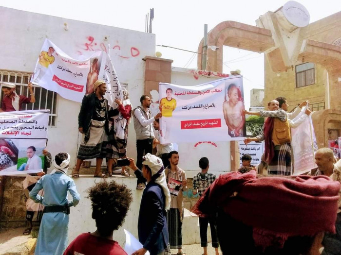 ودعوا، في وقفة احتجاجية نظموها أمام مبنى المحافظة المؤقت بشارع جمال في محافظة تعز، الجهات الأمنية بإعلان هوية الجناة في الجريمة.