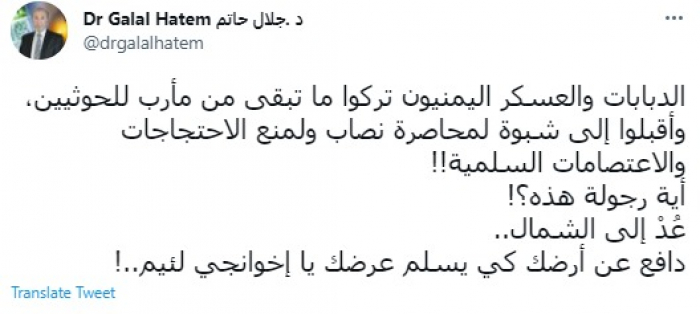 وقال في تغريدة عبر "تويتر" رصدها "المشهد العربي": "الدبابات والعسكر اليمنيون تركوا ما تبقى من مأرب للحوثيين، وأقبلوا إلى شبوة لمحاصرة نصاب ولمنع الاحتجاجات والاعتصامات السلمية".