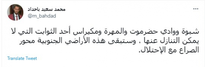 وكتب في تغريدة عبر "تويتر" رصدها "المشهد العربي": "شبوة ووادي حضرموت والمهرة ومكيراس أحد الثوابت التي لا يمكن التنازل عنها، وستبقى هذه الأراضي الجنوبية محور الصراع مع الاحتلال".