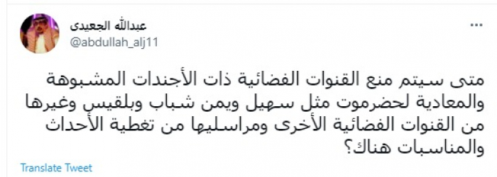 وقال في تغريدة عبر "تويتر" رصدها "المشهد العربي": "متى سيتم منع القنوات الفضائية ذات الأجندات المشبوهة والمعادية لحضرموت مثل سهيل ويمن شباب وبلقيس وغيرها من القنوات الفضائية الأخرى ومراسليها من تغطية الأحداث والمناسبات هناك؟".