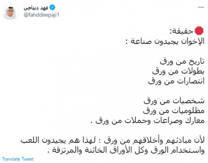 وكتب في تغريدة عبر "تويتر" رصدها "المشهد العربي": "حقيقة.. الإخوان يجيدون صناعة : تاريخ من ورق- بطولات من ورق- انتصارات من ورق - شخصيات من ورق - مظلوميات من ورق- معارك وصراعات وحملات من ورق".
