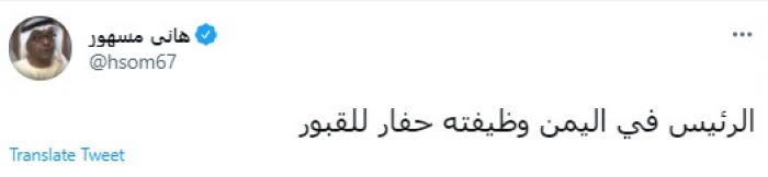 وقال في تغريدة عبر "تويتر" رصدها "المشهد العربي": "الرئيس في اليمن وظيفته حفار للقبور".