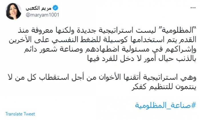 وكتبت في تغريدة عبر "تويتر" رصدها "المشهد العربي": "المظلومية ليست استراتيجية جديدة ولكنها معروفة منذ القدم يتم استخدامها كوسيلة للضغط النفسي على الآخرين وإشراكهم في مسئولية اضطهادهم وصناعة شعور دائم بالذنب حيال أمور لا دخل للفرد فيها".