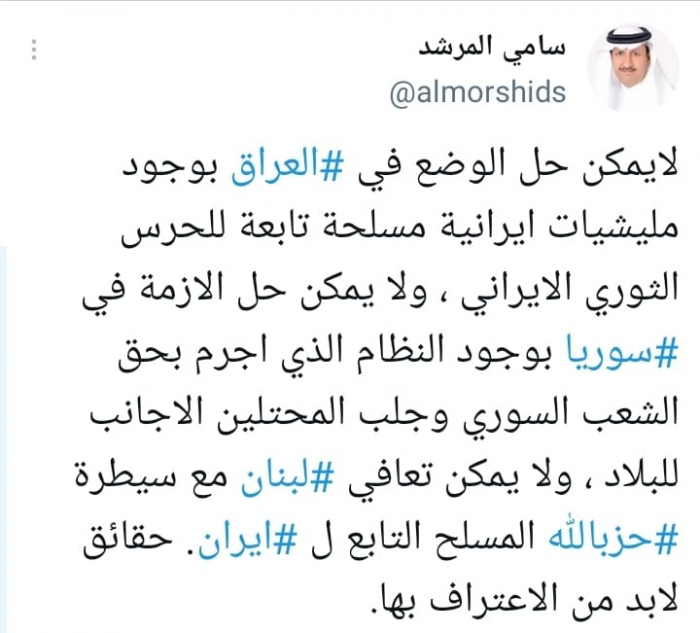 أكد المحلل السياسي السعودي سامي المرشد، أن الأوضاع في العراق وسوريا ولبنان لا يمكن حلها بوجود المليشيا المسلحة الموالية لإيران.