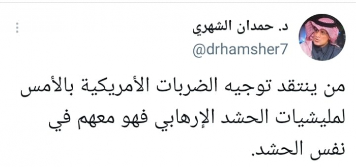 اتهم الباحث السياسي الدكتور حمدان الشهري، المنتقدين للضربات الأمريكية لمليشيات الحشد الشعبي الموالية لإيران بالانتماء إليها.