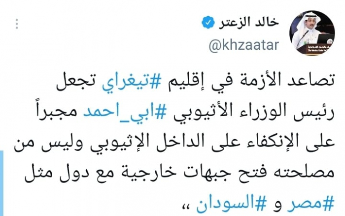 وأوضح في تغريدة على حسابه بموقع التدوين المصغر تويتر، اليوم إن: "تصاعد الأزمة في إقليم تيغراي تجعل رئيس الوزراء الإثيوبي آبي أحمد مجبراً على الإنكفاء على الداخل الإثيوبي وليس من مصلحته فتح جبهات خارجية مع دول مثل مصر والسودان".