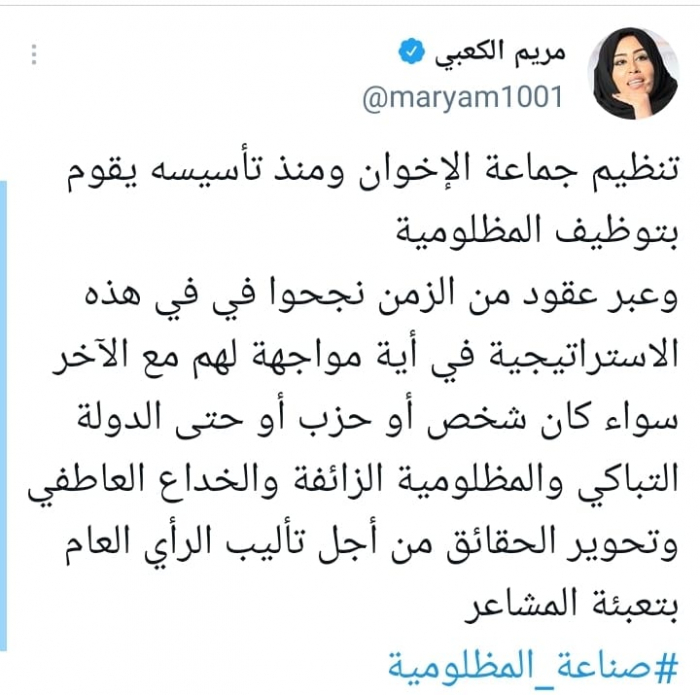 وأشارت في تغريدة على حسابها بموقع التدوين المصغر تويتر، اليوم إلى أن: "تنظيم جماعة الإخوان ومنذ تأسيسه يقوم بتوظيف المظلومية وعبر عقود من الزمن نجحوا في في هذه الاستراتيجية في أية مواجهة لهم مع الآخر".