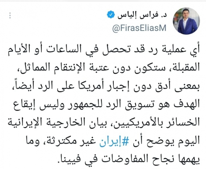 وقال في تغريدة على حسابه بموقع التدوين المصغر تويتر، اليوم إن: "أي عملية رد قد تحصل في الساعات أو الأيام المقبلة، ستكون دون عتبة الانتقام المماثل".