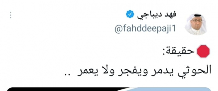 استنكر المحلل السياسي السعودي فهد ديباجي، جرائم مليشيا الحوثي الإرهابية، مؤكدا أنها تدمر وتفجر.