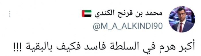 وأكد في تغريدة على حسابه بموقع التدوين المصغر تويتر، اليوم أن: "أكبر هرم في السلطة فاسد فكيف بالبقية؟".