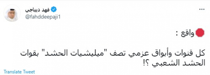استنكر المحلل السياسي السعودي فهد ديباجي، اليوم الثلاثاء، وصف القنوات والحسابات التابعة للقيادي الفلسطيني الإسرائيلي عزمي بشارة لمليشيات الحشد الشعبي بالعراق بالقوات.