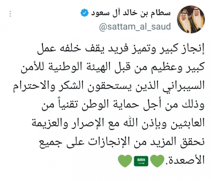 سطام بن خالد يشيد بالتفوق السعودي في الأمن السيبراني