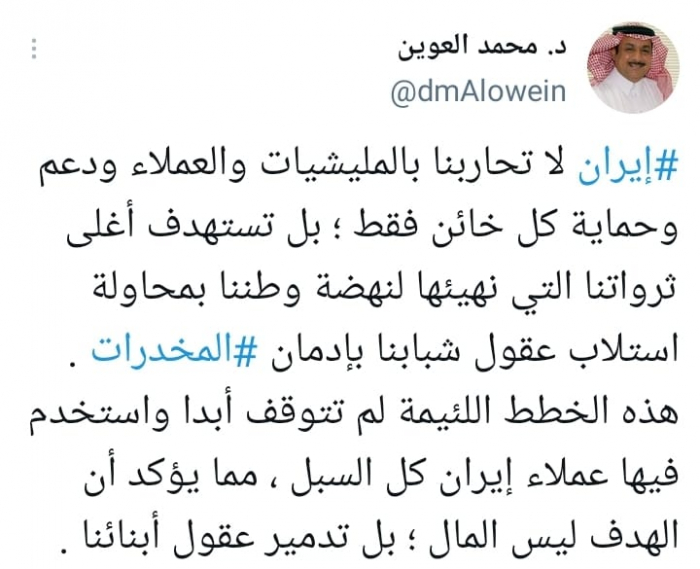 وأكد في تغريدة على حسابه بموقع التدوين المصغر تويتر، اليوم أن: "إيران لا تحاربنا بالمليشيات والعملاء ودعم وحماية كل خائن فقط؛ بل تستهدف أغلى ثرواتنا التي نهيئها لنهضة وطننا بمحاولة استلاب عقول شبابنا بإدمان المخدرات".