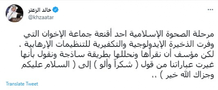 وكتب في تغريدة عبر "تويتر" رصدها "المشهد العربي": "مرحلة الصحوة الإسلامية أحد أقنعة جماعة الإخوان التي وفرت الذخيرة الإيدولوجية والتكفيرية للتنظيمات الإرهابية".